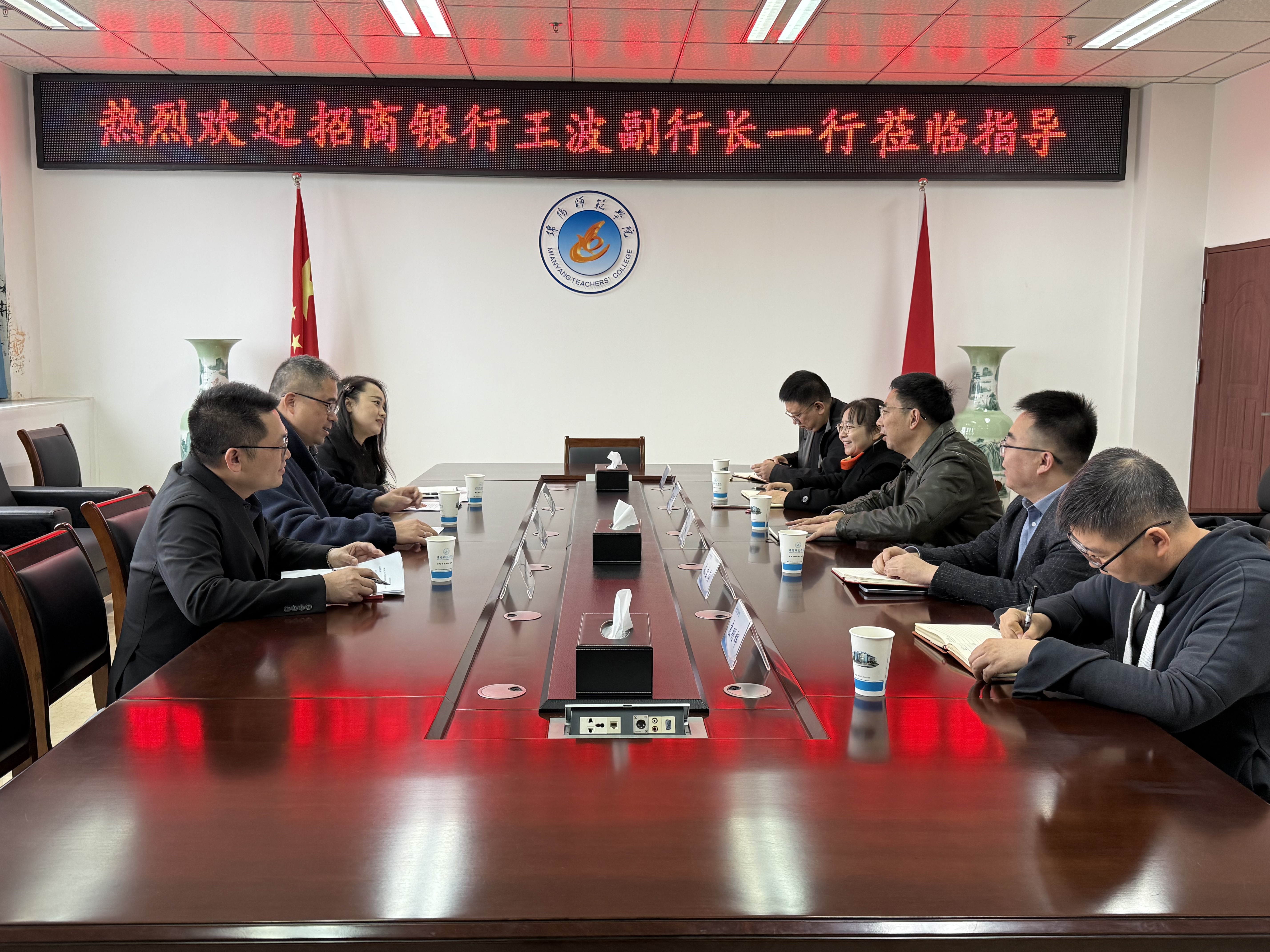 11月7日,招商银行股份有限公司绵阳分行副行长王波一行3人来校洽谈合作,校党委常委、副校长蒋伟,计划财务处负责人及相关人员参加洽淡。